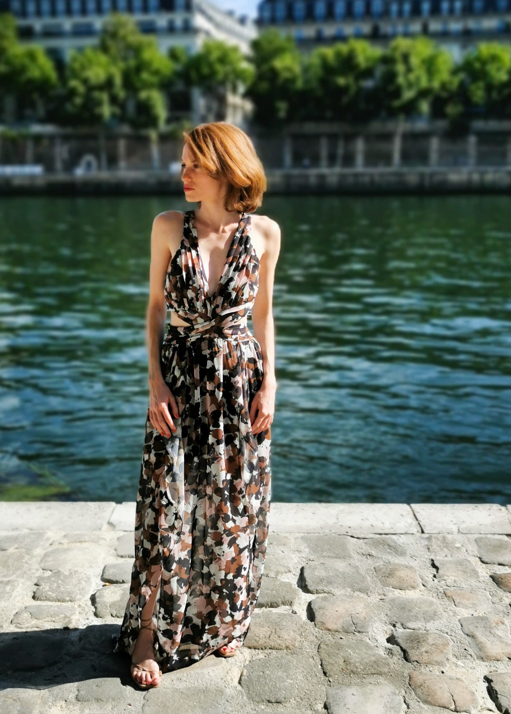 Robe longue à volants Dos nu en V Décolleté en V Fermeture invisible dans le dos Tissu conçu en France...